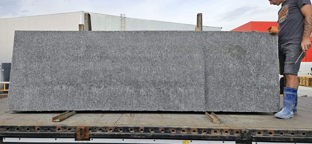 Granit Negru Fiamat Pompeii Black Lastra de 2 cm pentru Piese La Comanda. Detinem permanent stocuri mari de Lastre din Granit fiamat in diferite modele. Oferim Soluții Premium pentru Amenajări Exterioare. La noi gasesti placi mari (lastre) de granit, prelucrate la comandă în fabrica noastră modernă, dotată cu echipamente de ultimă generație. Transformăm lastrele în produse personalizate, adaptate perfect cerințelor tale, precum: